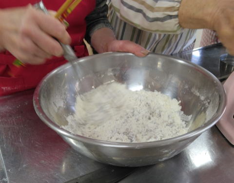 ②薄力粉とタンサン、ベーキングパウダーを混ぜ、 ふるいにかける。 ①を加えて、こねないように 粉気がなくなるまで、さっくり混ぜる。 |